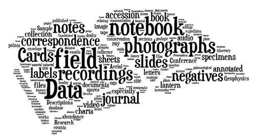 The workshop was preceded by a community survey designed to determine the prevalence of source material digitization and the types of documents being digitized as well as a method for discovering potential invitees to the workshop. iDigBio evaluator Shari Ellis coded and summarized the results of the survey and planning team members Christina Fidler, Larry Gall, Michelle Koo, James Macklin, Gil Nelson, Deb Paul, Tim White, Rusty Russell, Carolyn Sheffield, and Barbara Thiers combed them for agenda topics and invitees. A second survey—which the planning team referred to as workshop homework—was distributed to attendees to gather information about the types of source materials being digitized by workshop invitees. The associated word cloud produced by Deb Paul helped us visualize the results of the homework assignment.