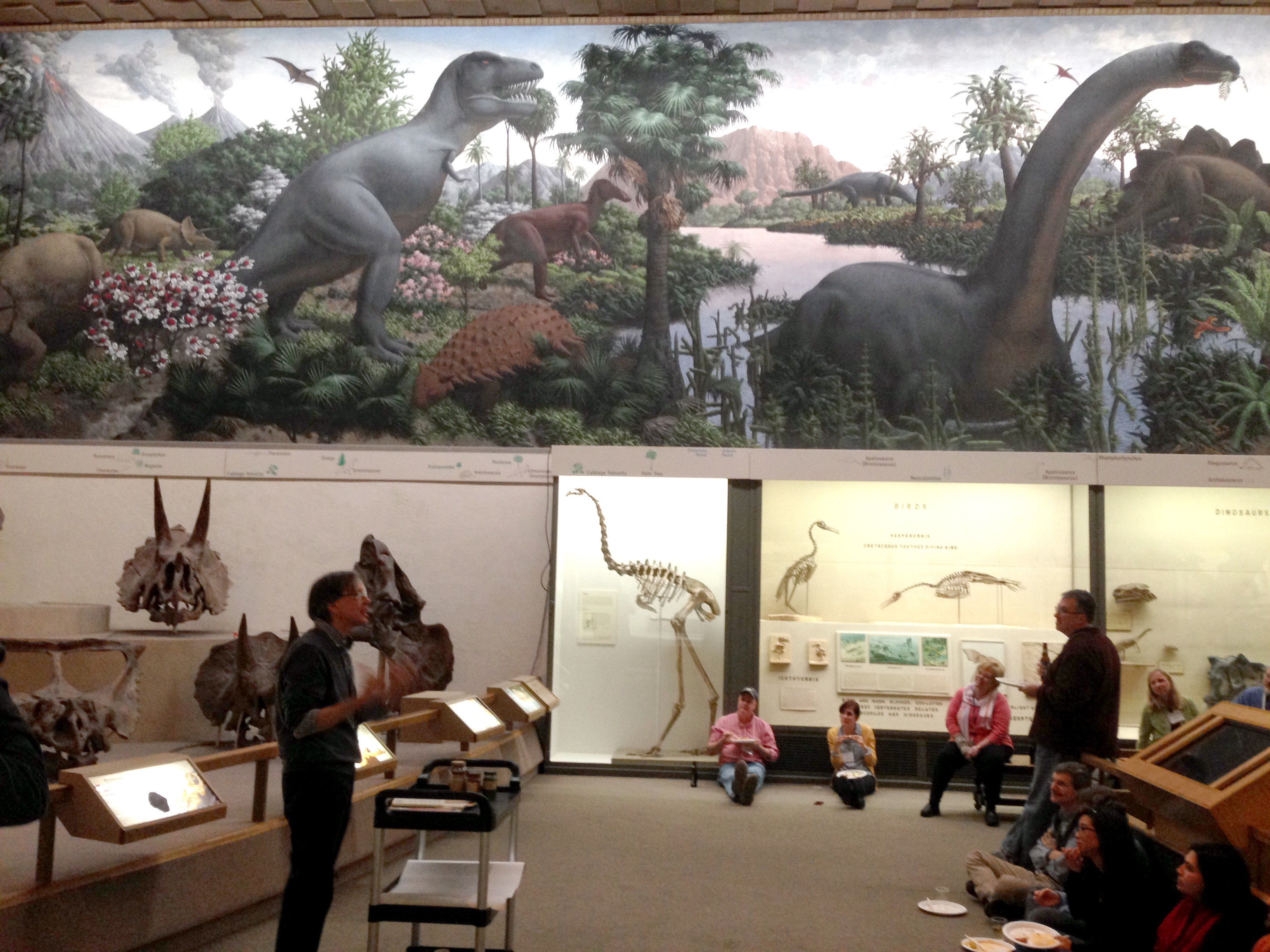 The first day culminated with a round of collections tours at the Peabody Museum, followed by a reception in the Great Hall of Dinosaurs. Armand Morgan, senior instructor in YPM’s public education program captivated participants with fascinating stories of the development of the Rudolf Zallinger murals that adorn the Great Hall and the Hall of Mammals, following which he led a tour of parts of the museum.