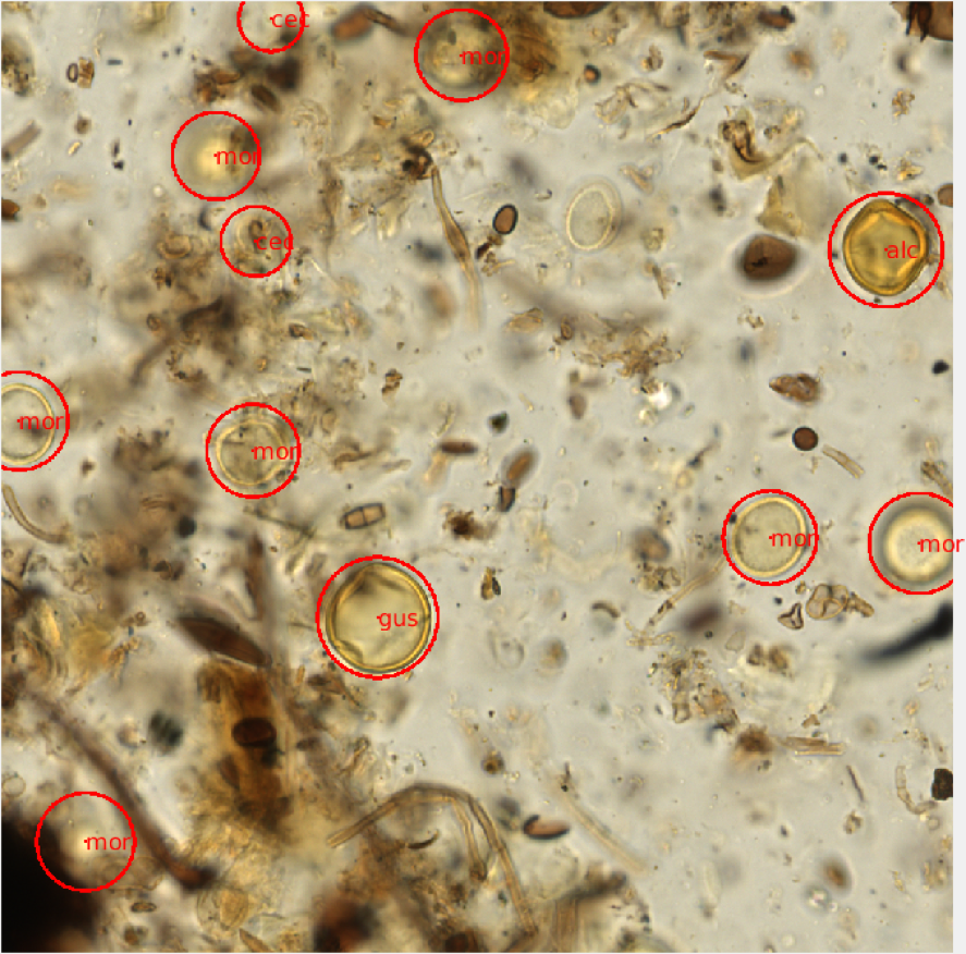 Figure 2- A visual representation of an annotated virtual microscopy pollen slide image. Each grain was circled and identified using a 3-letter taxonomic naming system. The identification and locality of each grain was saved as metadata for each image window. |