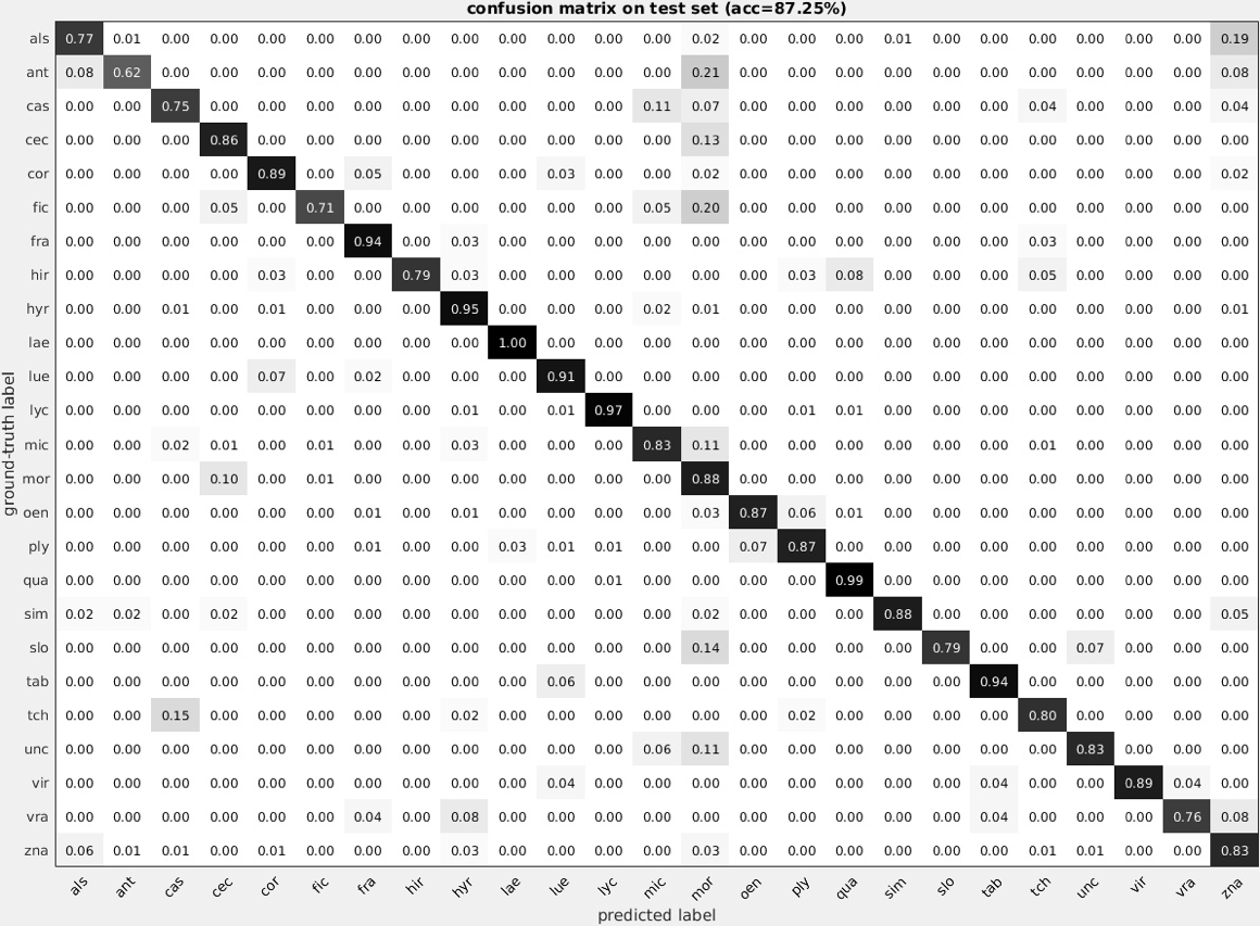 Figure 4- A confusion matrix was generated for the 25 most accurate pollen grains. The pollen identification was able to replicate my own counts at an accuracy of 87.25%.