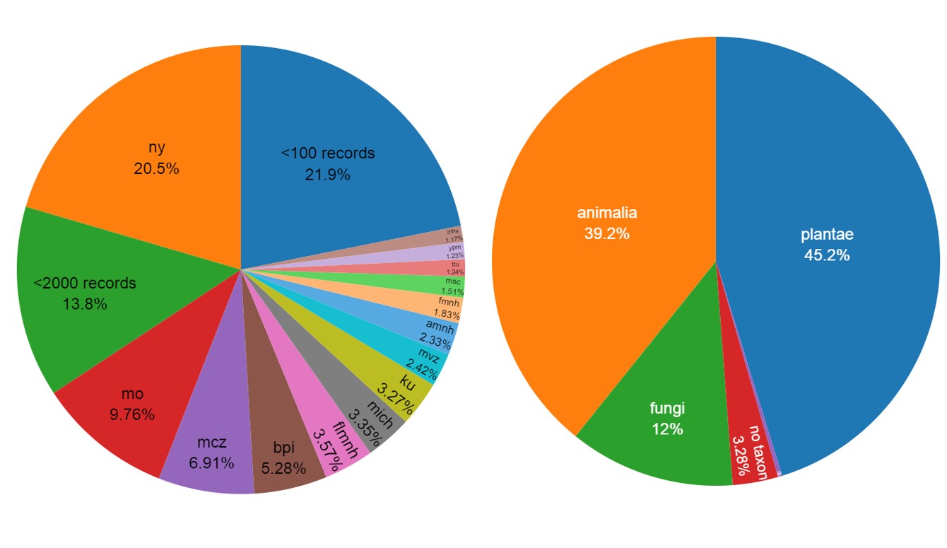 Proportion of data from Puerto Rico within iDIgBio by collection recordset size (left) and by kingdom (right).