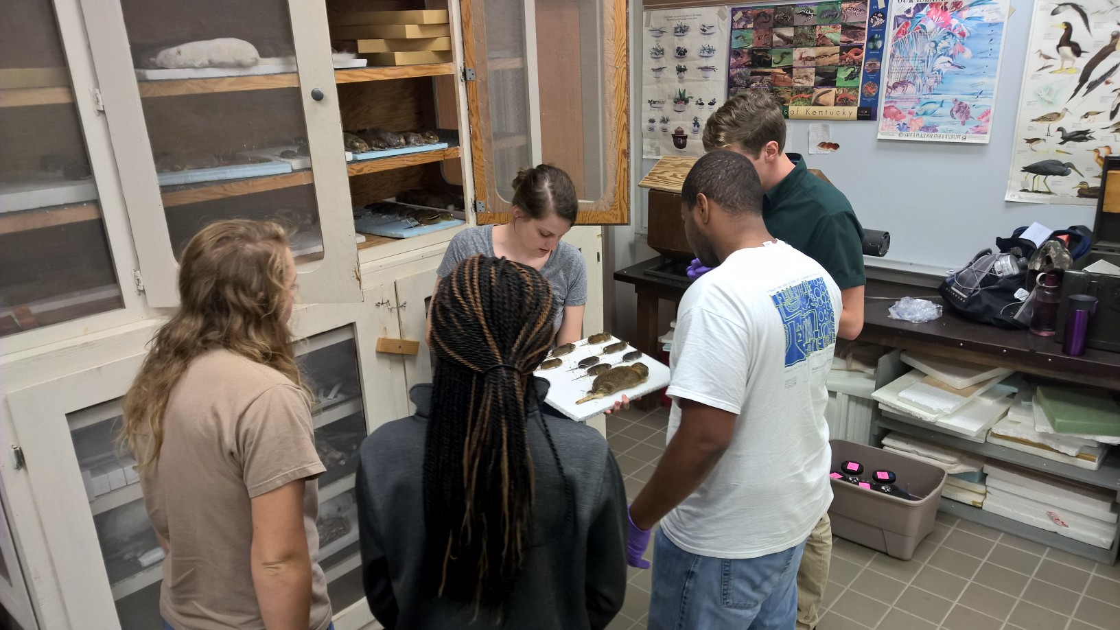 Students attending the Friday shadowing event selected to visit one or two from a range of collections, including fish, paleontological, crustacean, mammal, bird, and invertebrates, as well as the genomics and biodiversity labs, naturalist center, and biodiversity library. Participants databased and imaged fossils, cleaned skeletons fresh back from the dermested colony, learned to georeference specimen collection sites, sorted and re-shelved skins and skeletons, assisted in photographing skulls, and gleaned firsthand experience in the challenges and rewards of managing fluid-preserved fish and herp collections. Curators, collections managers, and collections assistants provided one-on-one opportunities, with plenty of time for interaction and engagement. At the end of a long morning, students and their hosts assembled for a catered lunch for final debriefing and discussion. One unintended consequence from the shadowing day was that two students discovered a new phylum (a chaetognath, or arrow worm) for the NCMNS Invertebrate Collection while sorting through an uncataloged lot.